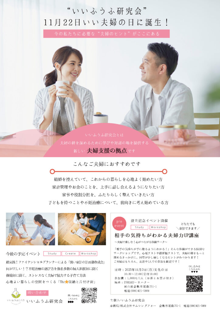 夫婦の絆を深めるために学びや対話の場を提供する新しい夫婦支援の拠点“いいふうふ研究会”が11月22日いい夫婦の日に誕生します!